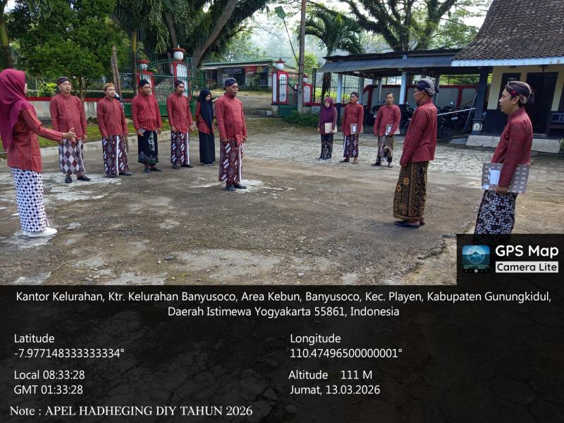 BANYUSOCO SIDA, Pemerintah Kalurahan Banyusoco melaksanakan apel dalam acara memperingati ke-271 berdirinya Daerah Istimewa Yogyakarta Tahun 2026. Ini berdasarkan Surat Edaran Bupati Gunungkidul Nomor 19 Tahun 2026 tentang Pedoman Peringatan Hari Jadi ke-271 Daerah Istimewa Yogyakarta Tahun 2026. Apel tersebut dilaksanakan pada hari Jum’at tanggal 13 Maret 2026 pukul 08.00 WIB di Halaman Kantor Balai Kalurahan Banyusoco Kapanewon Playen. Dalam apel tersebut diikuti oleh seluruh Pamong Kalurahan Banyusoco dan memakai seragam gagrak ngayogyakarta, serta dalam apel memakai bahasa jawa baik pada susunan acara, do’a dan aba-aba berbaris.