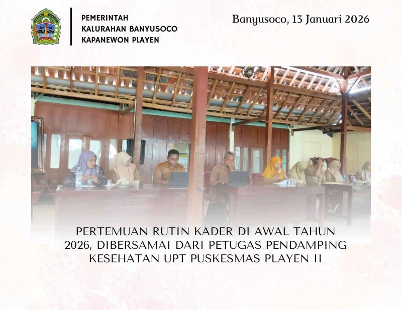 BANYUSOCO SIDA, Pada hari Selasa tanggal 13 Januari 2026 dilaksanakan pertemuan rutin Kader se Desa/Kalurahan Banyusoco. Pertemuan ini pertama kalinya pada Tahun 2026, dengan beberapa wajah baru dari Anggota Kader Kalurahan Banyusoco dan Tim Pendamping Kesehatan dari UPT Puskesmas Playen II. Pada saat pertemuan pertama kali ini dihadiri oleh beberapa Tim diantaranya Bapak Kepala UPT Puskesmas Playen II Bapak Arif Budiyanto, SKM., Ketua Tim Bapak Mahendra Agil, Ibu Asih, Bapak Hendi Astanto, Ibu Dwi Fuji Astuti dan Ibu Zahrotunnisa Damar. Beberapa hal disampaikan dalam kegiatan pertemuan kader tersebut, diantaranya adalah terkait kesehatan secara umum/ menyeluruh, tentang Stunting/Gizi, Perilaku Hidup Bersih dan Sehat, Penyakit menular dan tidak menular, Pengelolaan Sampah dan Pemantauan Jentik Nyamuk. Beberapah hal tersebut harus dijadikan target utama, dikarenakan itu merupakan hal terpenting sebagai tugas pokok dan fungsi sebagai Kader Kalurahan. Acara pertemuan kader berakhir pada pukul 12.30 WIB.