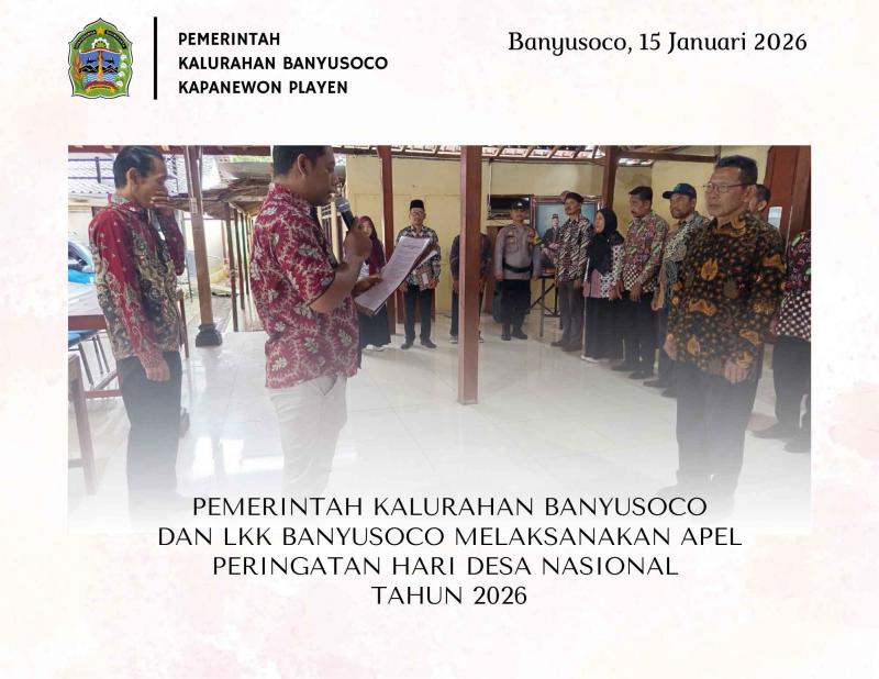 BANYUSOCO SIDA, Hari Kamis tanggal 15 Januari 2026 diperingati sebagai Hari Desa Nasional. Berdasarkan Surat dari Sekretariat Daerah Kabupaten Gunungkidul, mendasar Surat Edaran dari Sekretaris Jendral Menteri Dalam Negeri nomor : 100.3/100/10070/33 tentang Peringatan Hari Desa Naional (Hardesnas) Tahun 2026 agar Instansi Kalurahan melaksankaan Apel Hari Desa Nasional. Perangkat Desa/Pamong Kalurahan Banyusoco bersama Unsur Bamuskal, PKK, LPMK, Bhabinkamtibmas dan LKK Lainnya melaksanakan Apel Hari Desa Nasional di Aula Balai Kalurahan Banyusoco. Apel Peringatan Hari Desa Nasional, dimulai pada pukul 08.30 WIB berjalan dengan khidmat. Dalam amanat disampaikan Sambutan dari Gubernur Daerah Istimewa Yogyakarta, dengan tema Jogja Harmoni, Kalurahan Melayani, Mukti Membumi. Selain itu dibacakan Ikrar Bersama “ Kalurahan Melayani” yang ditirukan seluruh peserta Apel. Apel selesai pada pukul 09.00 WIB dilanjutkan dengan acara ramah tamah.