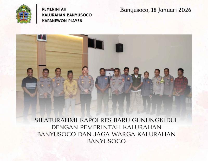 BANYUSOCO SIDA, Minggu Tanggal 18 Januari Pukul 20.00 WIB Kapolres Baru Gunungkidul melakukan kegiatan silaturahmi ke Pemerintah Kalurahan Banyusoco Kapanewon Playen. Kegiatan silaturahmi bukan di laksanakan di Balai Kalurahan Banyusoco tetapi dilaksanakan di Balai Kalurahan Bleberan Playen. Kegiatan tersebut dihadiri banyak tokoh, selain dari Bapak Kapolres Gunungkidul AKBP Damus Asa, S.H., S.I.K., M.H bersama jajaran Polres Gunungkidul, juga dihadiri Bapak Kapolsek Playen beserta jajarannya, Lurah Banyusoco dan Jajaranya serta dari Anggota Jaga Warga Kalurahan Banyusoco. Selain bertujuan silaturahmi dengan jajaran Pemerintah Kalurahan, kegiatan tersebut sebagai perkenalan dari Bapak Kapolres yang baru menjabat di Polres Gunungkidul. Disela- sela kegiatan silaturahmi juga disampaikan adanya komunikasi dan kerjasama dalam menjaga situasi kamtibmas yang ada di wilayah Kabupaten Gunungkidul. Sehingga dengan terjalinnya situasi kamtibmas yang kondusif dapat mewujudkan masyarakat yang aman dan tentram.