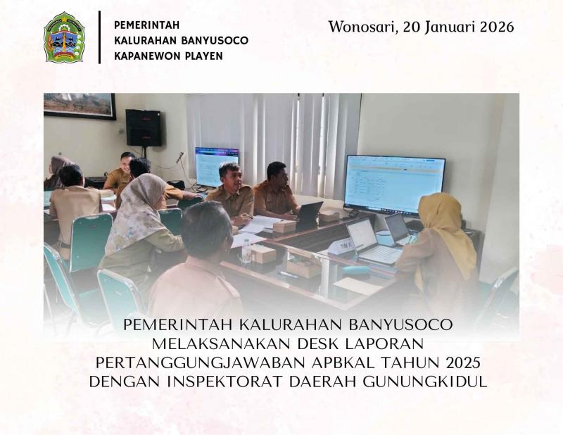 BANYUSOCO SIDA, Pada hari Selasa Tanggal 20 Januari 2026 Pemerintah Kalurahan Banyusoco Kapanewon Playen Kabupaten Gunungkidul melaksanakan Desk/Asistensi Penyusunan Laporan Pertanggungjawaban Anggaran Pendapatan dan Belanja Kalurahan Tahun 2025 di Kantor Inspektorat Daerah Kabupaten Gunungkidul. Hadir dalam acara tersebut yakni Bapak Daman Huri (Lurah Banyusoco), Bapak Sumarwanto (Carik), Bapak Tugiyat (Danarta), Bapak Nugroho (Pangripta) dan Ibu Tri Wahyuni (Tata Laksana). Kegiatan asistensi ini berdasarkan Peraturan Bupati Gunungkidul Nomor 18 Tahun 2020 tentang Pedoman Pembinaan dan Pengawasan oleh Inspektorat Daerah , dan Keputusan Bupati Gunungkidul Nomor 375/KPTS/2025 tentang Progam Kerja Pengawasan Tahunan Inspektorat Daerah Kabupaten Gunungkidul.Sebagai Tim Pendamping Kalurahan Banyusoco dari Inspektorat adalah Ibu Tatik Wijayanti, SE., Bapak Prananto, S.T,.MAP., dan Bapak Rizki Hartono Putro, A.Md.