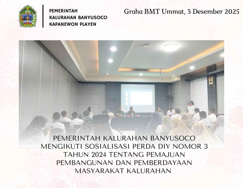 BANYUSOCO SIDA_Pemerintah Kalurahan Banyusoco Kapanewon Playen Kabupaten Gunungkidul pada hari Rabu tanggal 3 Desember 2025 menghadiri kegiatan Sosialisasi Peraturan Daerah Istimewa Yogyakarta Nomor 3 Tahun 2024 tentang Pemajuan Pembangunan dan Pemberdayaan Masyarakat Kalurahan. kegiatan tersebut diadakan oleh Dinas Pemberdayaan Masyarakat, Kalurahan, Kependudukan, dan Pencatatan Sipil Daerah Istimewa Yogyakarta bertempat di Graha BMT Ummat Jl. Pramuka No.36, Pandansari, Wonosari, Gunungkidul. Kegiatan berlangsung dari pukul 12.30 WIB sampai dengan pukul 15.00 WIB, berjalan dengan baik dan lancar. sebagai nara sumber dalam acara tersebut adalah Bapak Syarief Guska Laksana, S.H dari Komisi A DPRD Daerah Istimewa Yogyakarta.